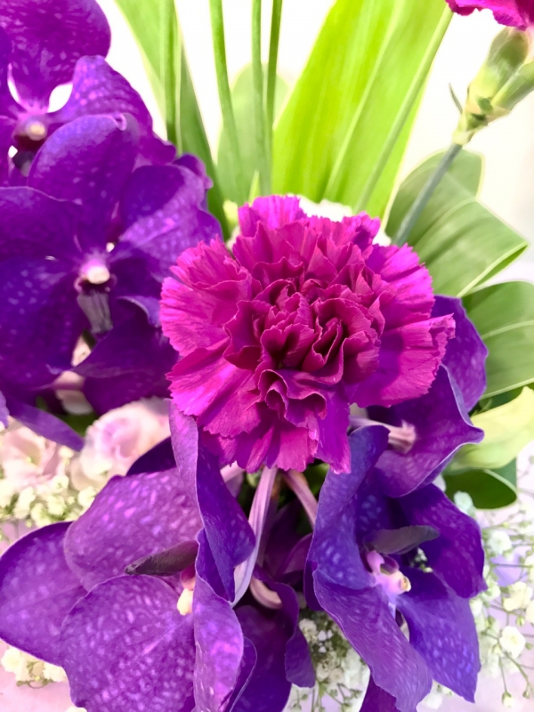 蘭を入れ紫系でまとめたお供えアレンジです。
