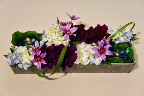 シックなブルー、バイオレット系のお花でまとめたアレンジです。