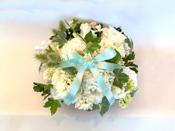 白で統一したお花にライトブルーのリボンが柔らかい印象のアレンジです。