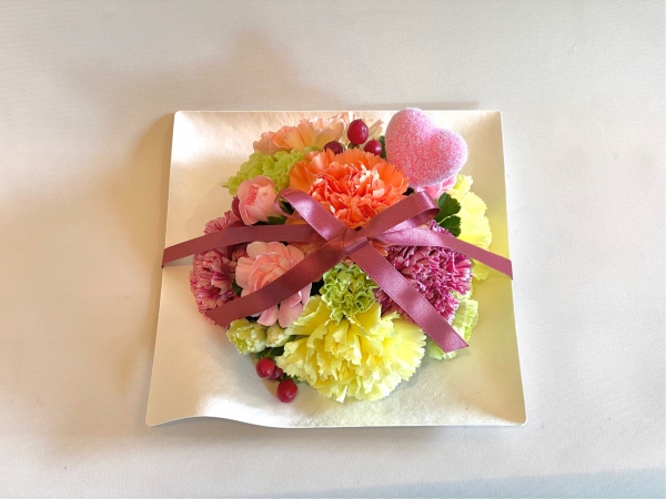ユニークな形状ながら品のあるデザインのWASARAにコロンと丸いアレンジ。リボンを添えて。