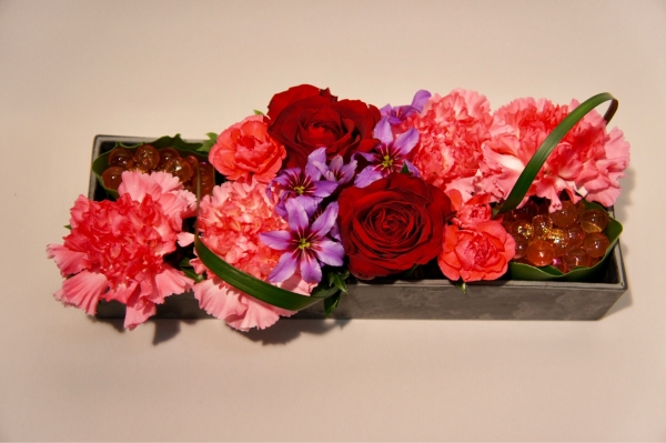 かわいい赤、ピンクのお花でまとめたアレンジ。