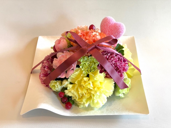 ユニークな形状ながら品のあるデザインのWASARAにコロンと丸いアレンジ。リボンを添えて。