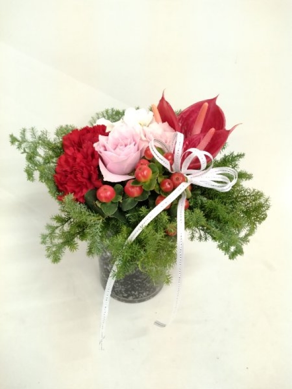 クリスマスシーズン用アレンジメントです。ピンクバラ、アンスリウム赤カーネーション赤などを使ったアレンジメントです