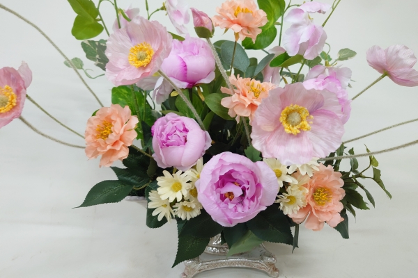 花材はスイトピー、ポピー、ピオニー、で優しいアレンジです