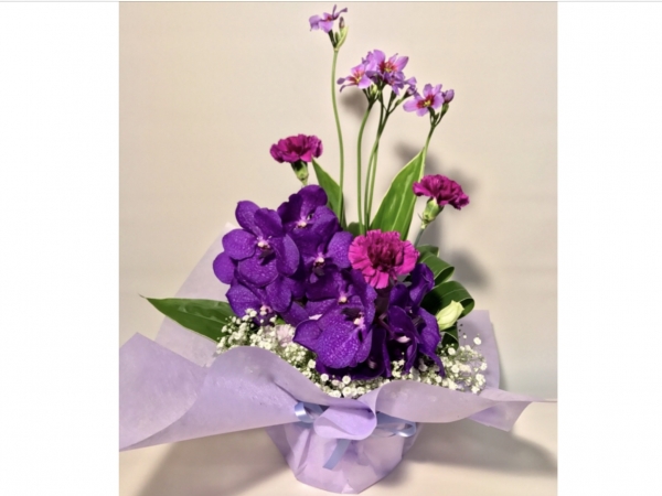 プリあフラワー[商品番号f-50]濃淡の紫の菊と花水木のアレンジ